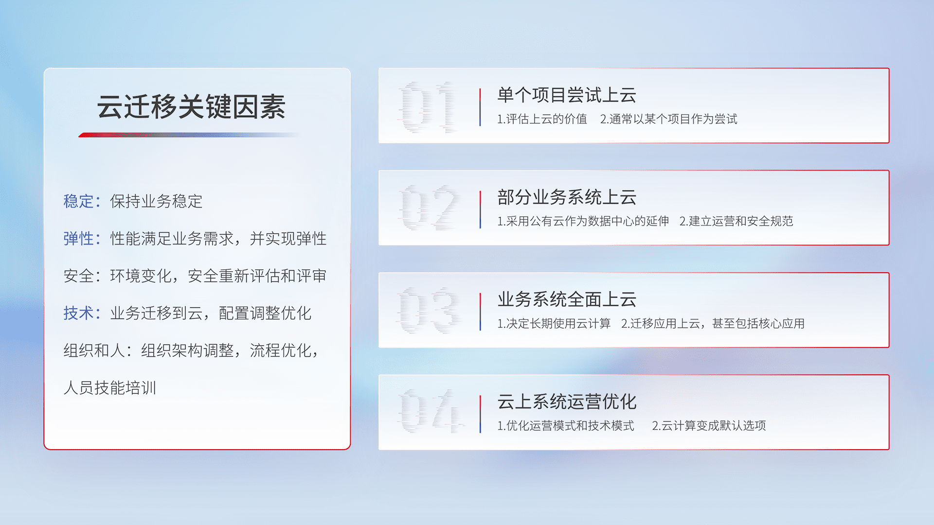 结合实际业务,,,从规划设计、、、云平台选型、、云原生改造、、、数据迁移、、、集成交付,,,,迁移全过程为客户识别最佳上云路径,,,,做好风险识别管理,,,设计网络架构、、身份权限、、、安全审计合规、、操作审计、、、日志审计、、监控告警策略、、多站点容灾设计等,,,,对云上基础设施进行整体规划,,,提升IT治理水平,,,,以满足弹性、、、高可用、、、高性能的需求。。。